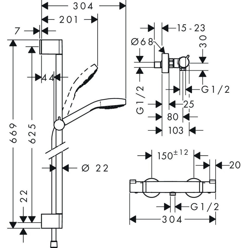 Hansgrohe Croma Select S Vario Baterie dus cu bara 65 cm cu termostat, alb/crom