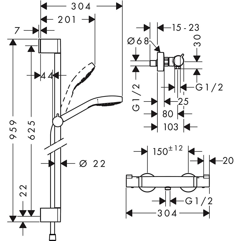 Hansgrohe Croma Select S Vario Baterie dus cu bara 90 cm cu termostat, alb/crom